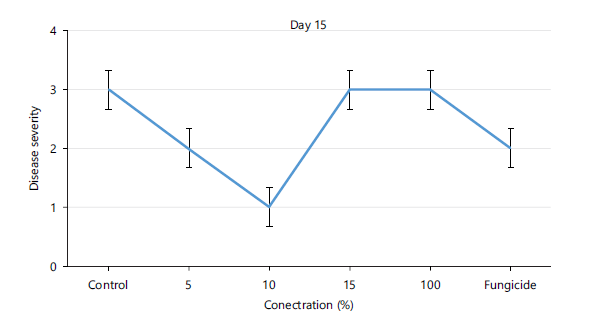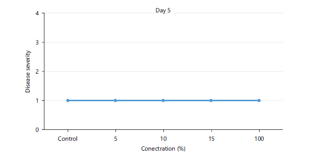 Disease severity of orange fruits infected with Lasiodiplodia sp. following treatment with different concentrations of Chromolaena odorata extracts: The observed results shown in Fig. 1 revealed that both the control (untreated) fruits and all the treated fruits with different concentrations (5, 10, 15, 100%) of the Chromolaena extract had the same disease severity (1.00±0.00) by day 5 of storage, indicating that they were all disease-free. As storage duration progressed till day 10, Fig. 2 showed that all treated fruits were still disease free, except the control and fruits treated with 15% extracts of C. odorata that had shown slight rottenness as evident by their mean disease severity values of 2.00±0.00. Even by days 15 and 20 in storage as observed in Fig. 3-4, respectively, fruits treated with 10%extractsstill maintained their diseased free status (1.00±0.00) when compared with fruits treated with 5% and 15% extract of C. odorata that showed moderate rottenness (3.00±0.03) while control and fruits treated with 100% C. odorata demonstrated complete rottenness (4.00±0.00). Likewise, as the storage durations became further extended to days 25 and 30, only fruits treated with 10% of C. odorata as shown in Plate 1 retained their non-diseased status (wholesomeness) of the orange fruits while Fig. 5-6 revealed that all other fruits (both control and treated fruits) had completely rotten.