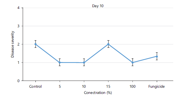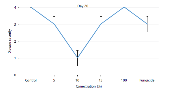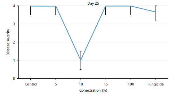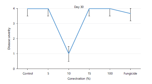 Statistical analysis: The data obtained for the disease severity, spore germination and mycelia growth were subjected to analysis of variance and where significant, the means were compared at 5% level of probability using Tukey’s Test (SPSS version 20). The values are expressed as Mean±Standard Deviation.